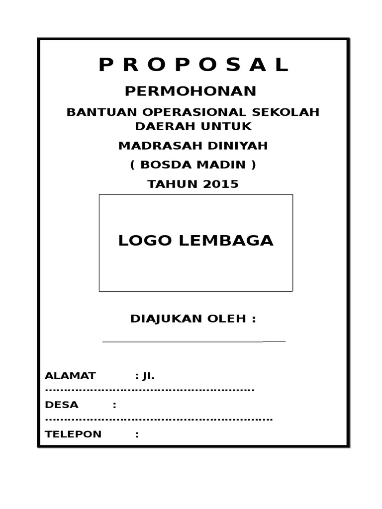 Contoh proposal pengajuan dana bosda. PROPOSAL BANTUAN DANA PERMOHONAN BANTUAN DANA PENDIDIKAN PEMERINTAH PROVINSI KEPULAUAN RIAU SEKOLAH TINGGI TEKNOLOGI INDONESIA TANJUNGPINANG PERMOHONAN BANTUAN DANA PENDIDIKAN PEMERINTAH PROVINSI KEPULAUAN RIAU 1.Latar Belakang Tujuan nasional sebagaimana tercantum dalam Pembukaan Undang- Undang Dasar 1945 adalah untuk melindungi segenap bangsa Indonesia dan seluruh tumpah darah Indonesia, dan ... NO URUT PROPOSAL PENGAJUAN DANA BOS DAERAH 92 KABUPATEN BOGOR 2016 YAYASAN DARUSSALAM Alamat Jalan Raya Caringin KM. 1 Kampung Curug Dengdeng RT. 02/03 Desa Caringin Kecamatan Caringin Kabupaten Bogor 16730 Nomor proposal bosda tahun 2015 Assalamualaikum Wr.Wb. Pemberian Hibah Dana Pendampingan Bantuan Operasional Sekolah (BOS) bertujuan untuk mewujudkan sekolah murah pada SD/SDLB/MI dan SMP/SMPLB/MTs di Kabupaten Grobogan, serta untuk meringankan beban masyarakat terhadap pembiayaan pendidikan dalam rangka wajib belajar 9 tahun yang bermutu. Contoh proposal pengajuan dana bosda . Analisis hasil belajar kurikulum 2013 format microsoft word revisi 2016. 1 kampung curug dengdeng rt. Contoh proposal bosda 2016. Dalam pembuatan proposal tentunya kita membutuhkan contoh yang baik dan benar agar proposal yang kita buat juga benar dan akan di terima oleh pihak yang dituju. ...