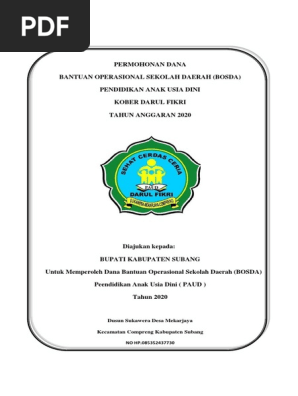 Demikian Proposal Pengajuan Permohonan Bantuan Dana BOP PAUD Tahun 2021, atas Perhatiannya kami Ucapkan terima Kasih Lebak, 06 Januari 2020 Kepala Sekolah TK SUKMA AYU MULYANAH . 6 LAMPIRAN LAMPIRAN KELENGKAPAN ADMINISTRASI PROPOSAL PENGAJUAN BANTUANBOP PAUD TAHUN 2020 . 7 PROPOSAL PERMOHONAN DANA HIBAH BANTUAN OPERASIONAL SEKOLAH UNTUK MADRASAH DINIYAH (BOSDA MADIN) KABUPATEN NGANJUK TAHUN ANGGARAN 2015 MADRASAH DINIYAH DARUSSALAM TINGKAT ULA DESA SAMBIROTO KECAMATAN BARON KABUPATEN NGANJUK 1. 2. LEMBAGA PENDIDIKAN ISLAM & SOSIAL MADIN DARUSSALAM Jl. Kenanga Sugihwaras Sambiroto Baron Nganjuk Tlp. 03585770240 ... Berikut adalah contoh proposal pencairan dana bosda , proposal bosda , contoh proposal pengajuan dana bos smp, contoh proposal pencairan dana bos, contoh format surat permohonan pencairan dana , contoh proposal bosda , contoh surat permohonan pencairan dana bos, surat permohonan pencairan dana bos, contoh surat permohonan pencairan dana bop, semoga bermanfaat.