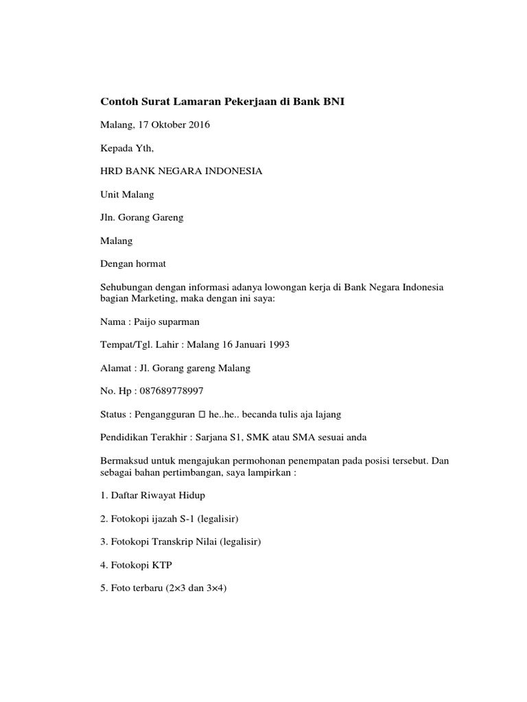 Berikut di bawah ini adalah beberapa contoh surat lamaran kerja di bank yang bisa anda jadikan bahan referensi. 1. Contoh Surat Lamaran Kerja di Bank BNI. Bank BNI atau Bank Negara Indonesia merupakan salah satu lembaga keuangan perbankan yang memiliki banyak cabang di berbagai daerah, bahkan sampai ke pelosok.