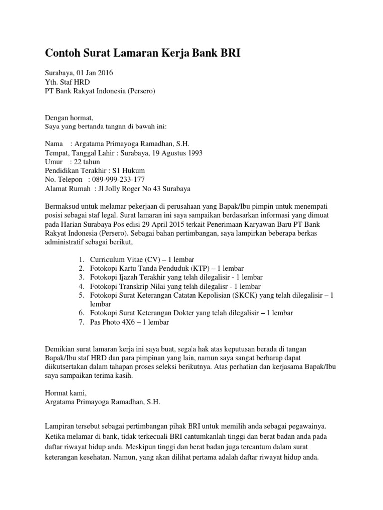 Contoh surat lamaran kerja di bank bri