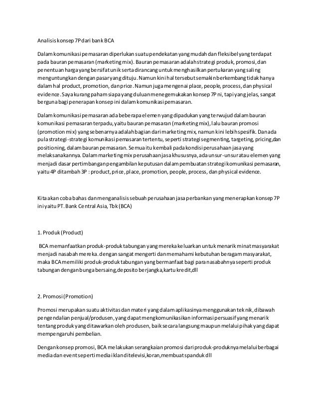 Analisa swot pt bca tbk 1. Posisi bank bca sebagai standard setter dari bankbank pesaingnya bukan hanya di produk layanan tetapi untuk penambahan jenis electronic delevery channel nya menjadi benchmark bagi para pesaing. Sejalan dengan tekad pemerintah yang terus mengembangkan perekonomian indonesia. BCA secara resmi berdiri pada tanggal 21 Februari 1957 dengan nama Bank Central Asia NV. Banyak hal telah dilalui sejak saat berdirinya itu, dan barangkali yang paling signifikan adalah krisis moneter yang terjadi pada tahun 1997. Krisis ini membawa dampak yang luar biasa pada Untuk itulah PT. BCA Tbk yang merupakan salah satu perusahaan perbankan terbaik di Indonesia merasa perlu mengidentifikasi setiap kekuatan dan kelemahannya dan ... Analisis SWOT Bank BCA Diposting oleh yUncemoon di 20.36 Analisis SWOT : Menambah rentang produk dan fitur e-banking, Mempertahankan ekuitas merek dengan memeprtahankan biaya transaksi yang murah, Mempertahankan citra perusahaan yang baik dengan mensponsori kegiatan-kegiatan sosial, Cepat dan tanggap atas keluhan dan kritik nasabah,