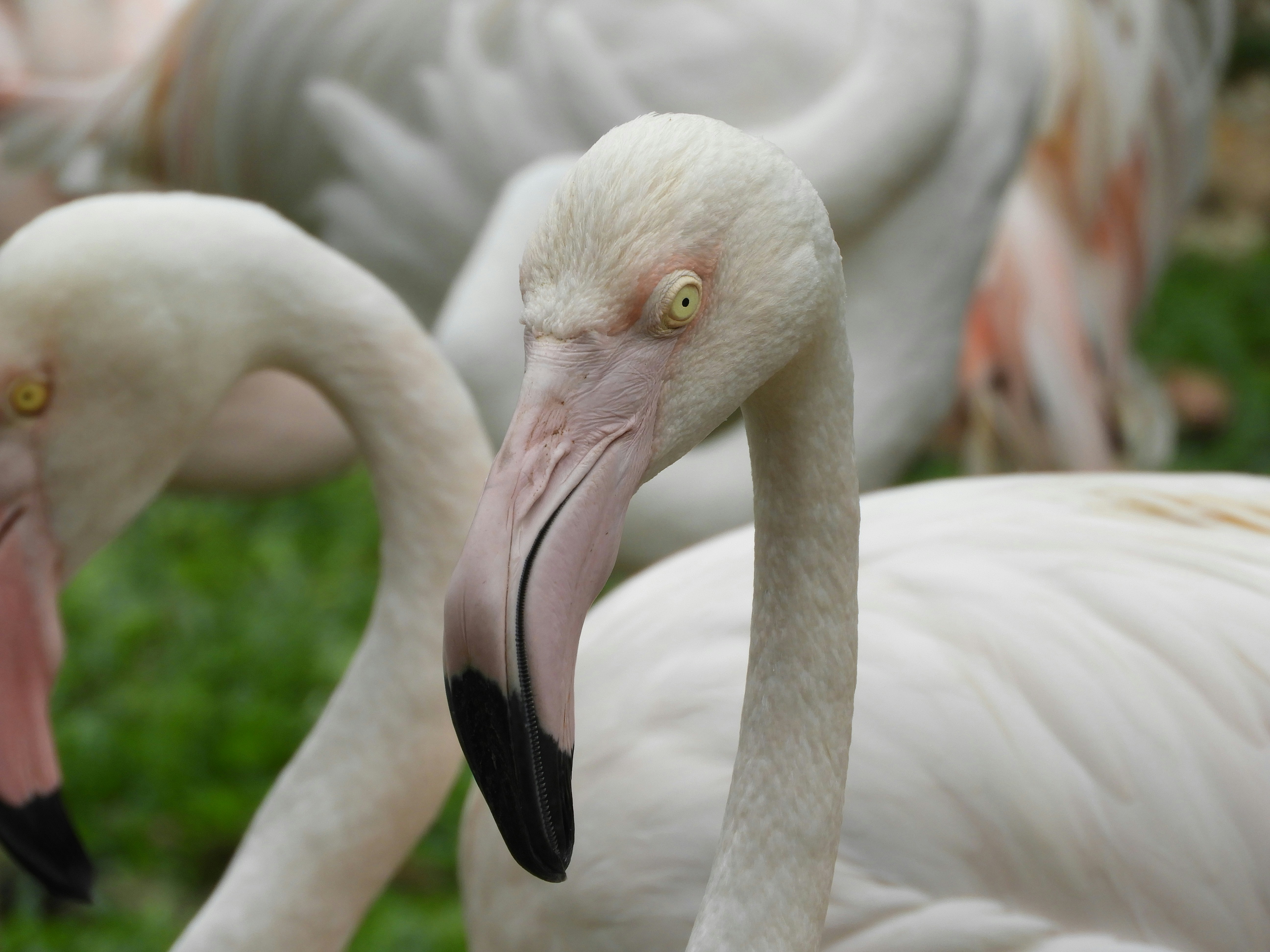 white and pink flamingo birds on green grass during daytime