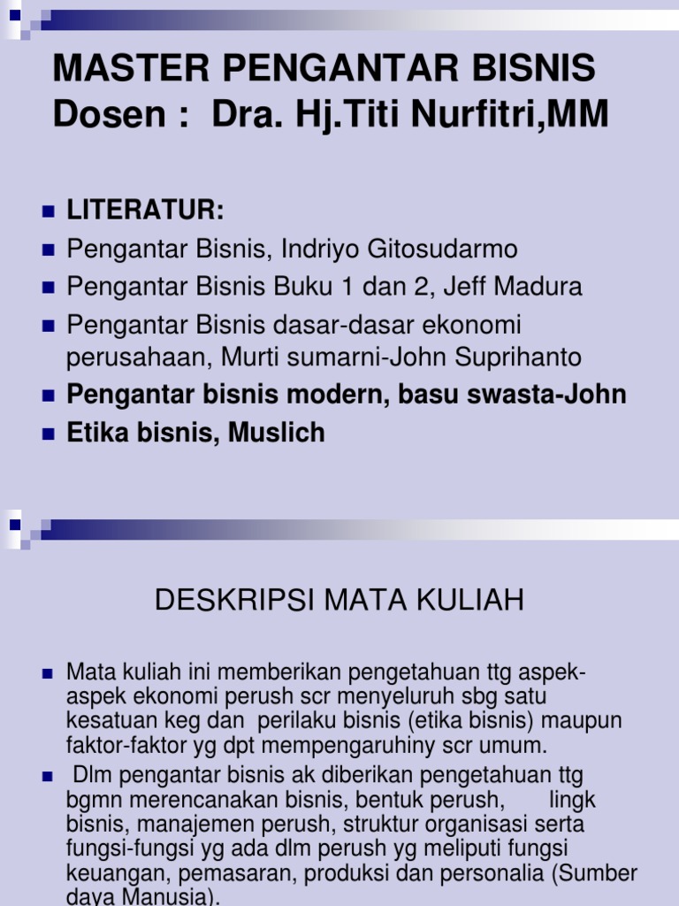 Alias pengantar ke dalam materi utama. Diantara materi-materi pengantaritu seperti bisnis dan lingkungan bisnis, globalisasi ekonomi dan bisnis internasional, ...