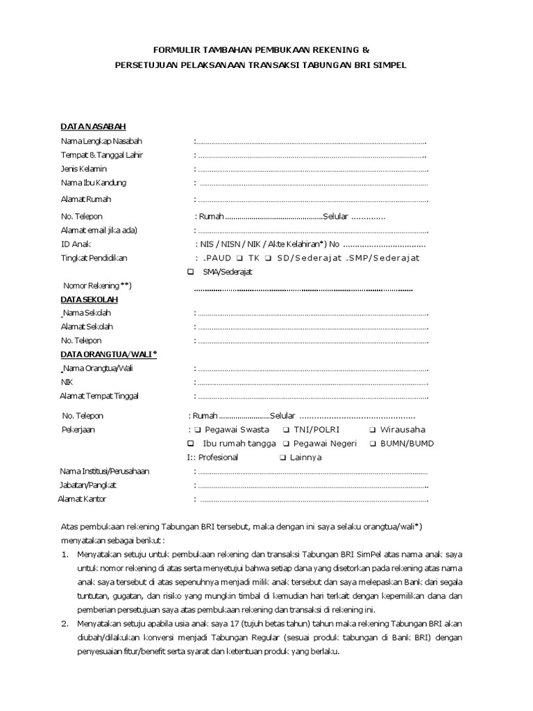 Formulir buka rekening bank bri. Lengkap disertai gambar Contoh Surat Permohonan Pembukaan Rekening Bank Bri.. Berbagai keperluan bank yang diwakilkan kepada orang lain semuanya harus menggunakan surat kuasa dari pemberi wewenang kepada penerima wewenang misalnya saja seperti penarikan uang tunai dari rekening bank melalui teller. Penerima BLT yang membuka rekening di bank-bank milik negara yang dilibatkan, dipastikan tidak dikenai tarif pembukaan rekening serta nonbunga perbankan. "Himpunan Bank Negara, misal BRI itu sudah siap menyatakan membantu percepatan pembukaan rekening tanpa harus ada biaya dan juga tidak ada bunga. Rekening di BRI Account with BRI Rekening di Bank lain Account with the other Banks Kartu Kredit BRI BRI credit Cord Holder Kartu Kredit Bank Lain Others Banks Credit Card Holder juta 1-250.000 - 1,750.000 3250.000 -4.250.ooo > 1 miliar Hasil Usaha/Business Profit Suami/lstri atau Orang tua/spouses or Tabungan/ Saving Ciro/ Current Syarat Buka Rekening BRI BritAma X. Berikut syarat buka rekening BRI BritAma X: Usia calon nasabah minimal 17 tahun dan maksimal 35 tahun. Mengisi formulir yang diberikan untuk membuka rekening. Dokumen identitas diri seperti KTP atau NPWP untuk WNI dan KIMS/KITAP/KITAS untuk WNA. Setoran awal minimal Rp100 ribu.