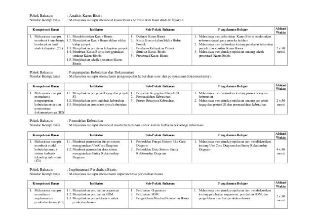 Model Proses Bisnis tentang konteks organisasi dan model proses bisnis proses bisnis dalam 2 x 50 proses analisis bisnis menit (C3) Pokok Bahasan : Analisis Kasus Bisnis Standar Kompetensi : Mahasiswa mampu membuat kasus bisnis berdasarkan hasil studi kelayakan Kompetensi Dasar Indikator Sub-Pokok Bahasan Pengalaman Belajar Alokasi Waktu 1.