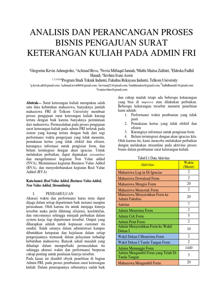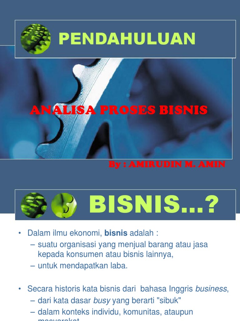 Full PDF Package Download Full PDF Package. This Paper. A short summary of this paper. 32 Full PDFs related to this paper. Read Paper. analisis proses bisnis. Download. Analisis Proses Bisnis by : Sol’s Mata Kuliah 2 SKS Definisi-Definisi Parsial Proses adalah sekumpulan aktivitas yang mengubah masukan menjadi keluaran Aktivitas terkait ...