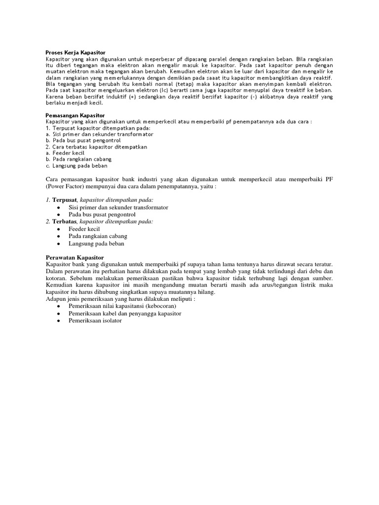 Cara pemasangan kapasitor bank industri yang akan digunakan untuk memperkecil atau memperbaiki PF (Power Factor) mempunyai dua cara dalam penempatannya, yaitu : 1. Terpusat, kapasitor ditempatkan pada: Sisi primer dan sekunder transformator. Pada bus pusat pengontrol. 2. Pemakaian kapasitor bank dimaksudkan untuk meminimalkan efek atau melawan sifat dari beban induktif dengan cara memasang paralel dengan beban. Kesimpulannya, secara tidak langsung kapasitor bank ini adalah beban atau load untuk jaringan listrik itu sendiri. May 26, 2021 · Selain itu, kapasitor bank juga difungsikan sebagai penyeimbang muatan induktif. Untuk lebih lengkapnya, berikut ini fungsi dari kapasitor bank yang perlu Anda ketahui: Kapasitor bank dapat memperbaiki faktor daya pada jaringan. Pemasangan kapasitor bank membantu menjaga stabilitas tegangan. Dalam penentuan kapasitas kapasitor bank yang akan dipasang harus sesuai dengan kebutuhan daya reaktif yang ada agar investasi pemasangan kapasitor bank bisa lebih efektif dan efisien. 4.2 Perhitungan Daya Kapasitor Dalam perbaikan faktor daya terjadinya over kompensasi akan menyebabkan jaringan menjadi kapasitif, selain itu juga akn ...