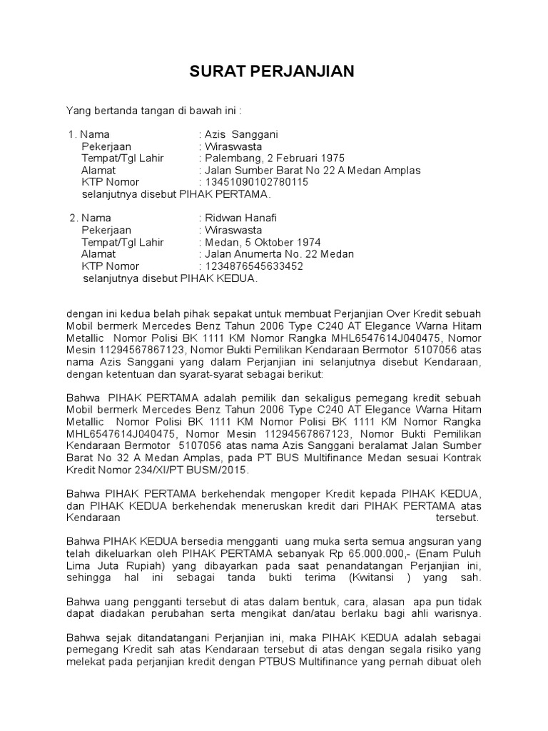 Contoh surat perjanjian over kredit motor archives gawe cv. Surat ini berisi tentang pernyataan bahwa proses kredit telah diambil alih oleh orang lain atau disebut juga dengan pihak kedua yang nantinya bahwa pihak pertama tidak lagi melakukan proses kredit dan tidak bertanggung jawab lagi. Artikel manfaat terkait belum ditemukan.