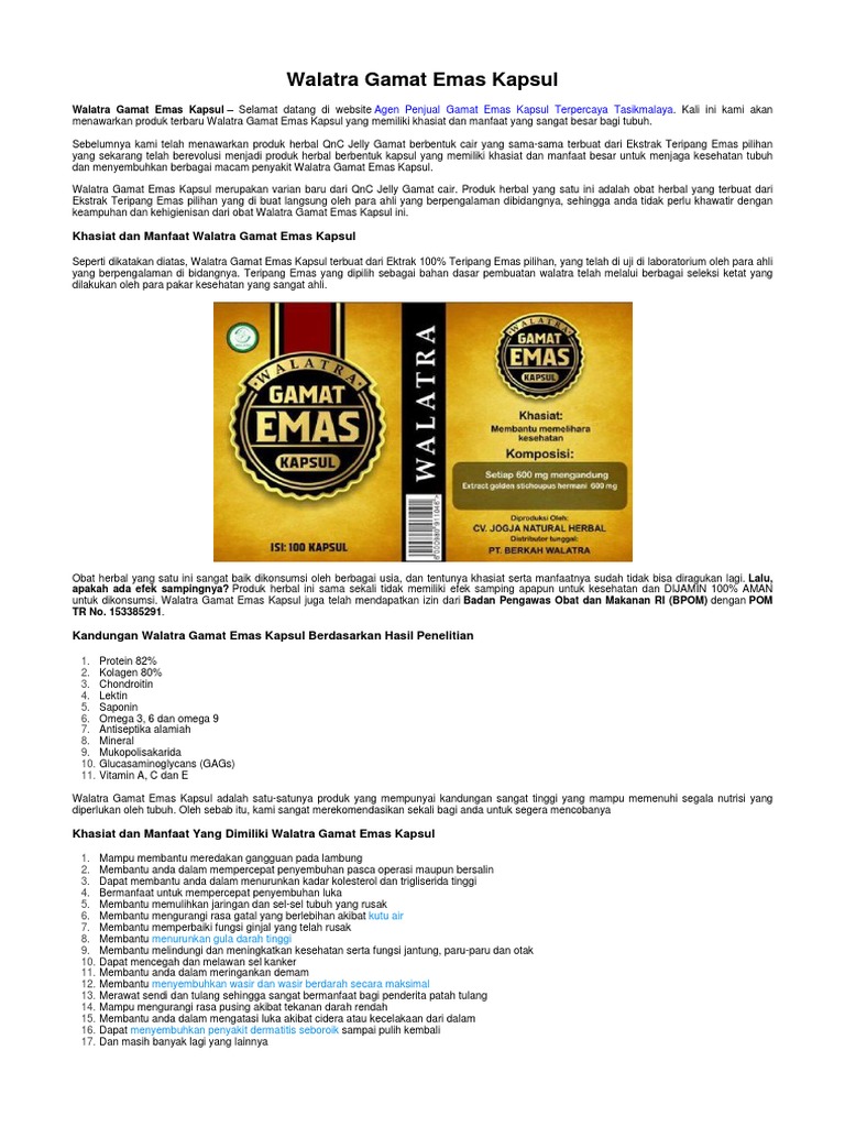 Khasiat dan Manfaat Walatra Gamat Emas Kapsul. Nah, dibawah ini merupakan beberapa khasiat dan manfaat yang bisa Anda dapat dengan mengkonsumsi Walatra Gamat Emas Kapsul. Membantu mempercepat penyembuhan luka dari dalam (luka luar maupun dalam) Membantu meredakan gangguan sakit lambung. Membantu meringankan sakit pada persendian / arthritis.