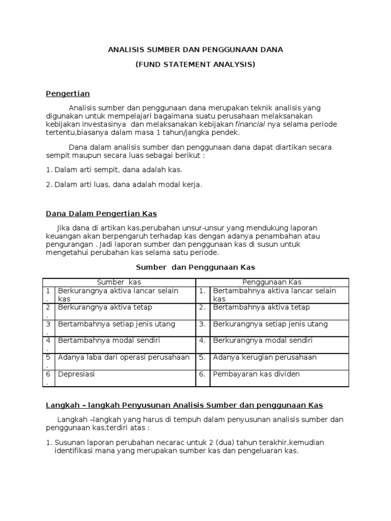 SUMBER DAN PENGGUNAAN DANA ( MODAL KERJA / KAS ) Disampaikan Oleh : A.Zulkarnain Estu.SE,Akuntan Berikut ini adalah contoh Penyusunan Laporan Modal Kerja PT.Indirasari . Dengan membuat Neraca Perbandingan 2008 dan 2007 sebagai berikut : PT.INDIRASARI Neraca yang diperbandingkan 31 Desember 2007 dan 2008 Keterangan 2007 2008 Naik Turun Kas 545 ... adapun mengenai pengertian sumber dan penggunaan dana dapat diketahui berdasarkan defenisi yang dikemukakan oleh s. munawir (1999 : 110) sebagai berikut bahwa, analisa sumber dan penggunaan dana merupakan suatu alat analisa keuangan yang sangat penting bagi finansial manajer atau bagi para calon kreditur atau bagian bank dalam menilai permintaan … Laporan tersebut menggambarkan transaksi dan perubahan dari masing-masing elemen tersebut yang mencerminkan adanya sumber atau penggunaan dana. Setelah mengetahui apa kegiatan utama dalam mendapatkan dana perusahaan, berikut penggunaan dana perusahaan: Membayar Kewajiban (Utang) Penggunaan dana dapat dilakukan untuk pembayaran utang yang jatuh ...