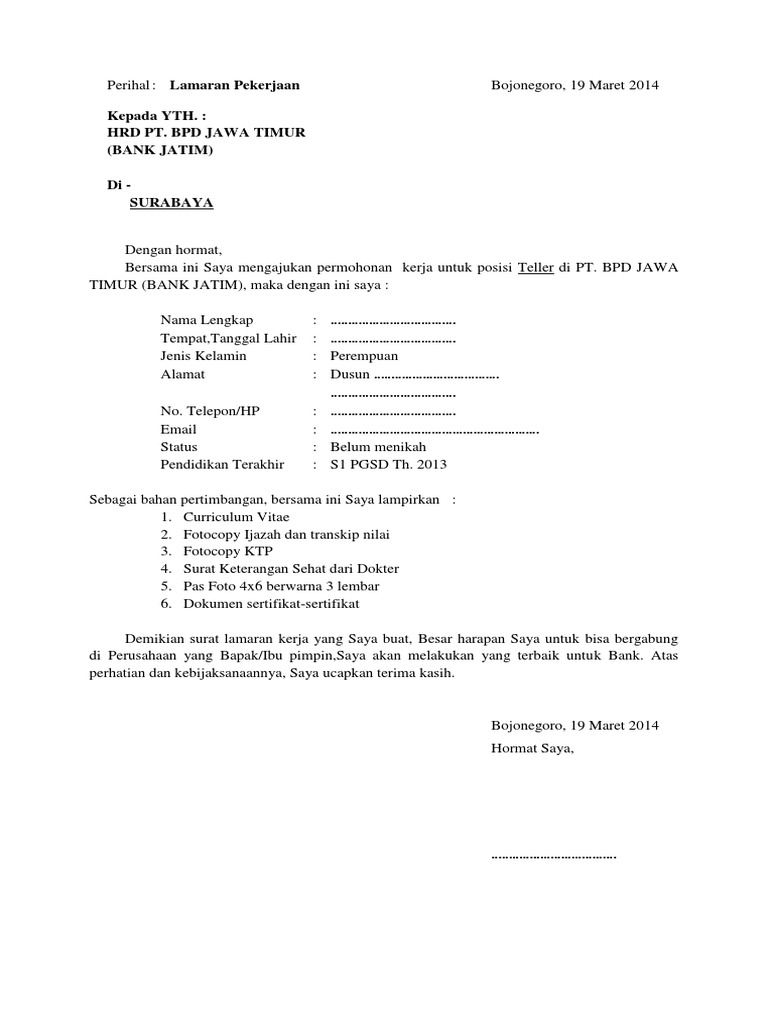 Menulis surat lamaran kerja boleh dalam bahasa Inggris maupun Indonesia. Namun, cover letter berbahasa Inggris umumnya lebih cepat dilirik oleh bank-bank internasional. Ada banyak posisi yang tersedia di bank mulai dari kasir, teller, petugas pinjaman, manajer, penasihat keuangan, bankir investasi, manajer kantor cabang, dan lain sebagainya.. Oleh karena itu, buatlah surat pengantar yang ... Apr 26, 2021 · Jika kamu mengajukan dengan status karyawan, maka pihak bank akan meminta bukti status kamu sebagai karyawan tersebut. Salah satunya memberikan dokumen persyaratan berupa Surat Keterangan Kerja. Sehingga pihak bank melalui surat yang dikeluarkan HRD perusahaan tersebut bisa memastikan bahwa kamu memang bekerja di suatu perusahaan.
