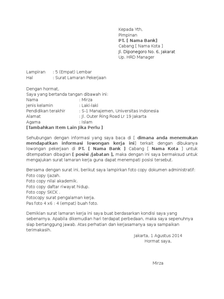 Surat lamaran kerja bank