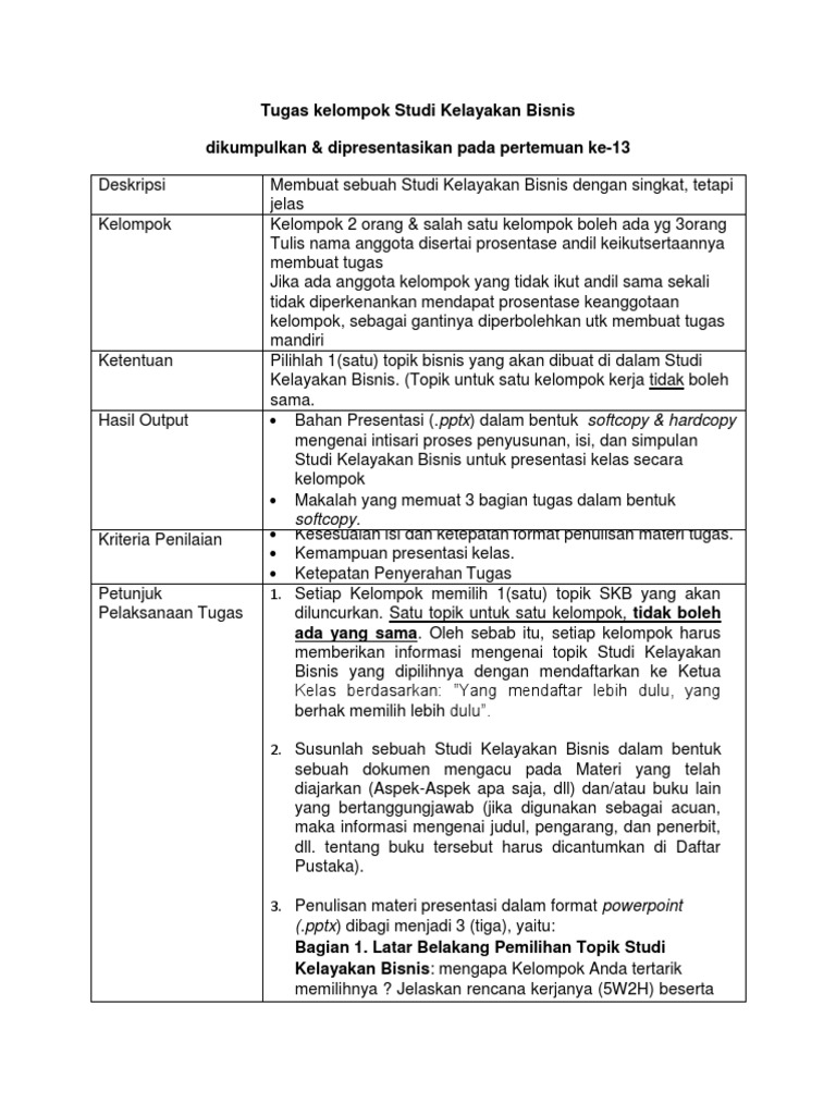 Studi kelayakan bisnis dilakukan untuk mengidentifikasi masalah dimasa yang akan datang dengan kata lain dengan adanya studi kelayakan bisnis dapat memberikan pedoman atau arahan kepada usaha yang akan dijalankan nantinya. Terkadang dalam prakteknya, sekalipun telah dilakukan studi secara baik dan benar 26 Mar 2017 — PDF | Studi Kelayakan Bisnis | Find, read and cite all the research you need on ResearchGate.