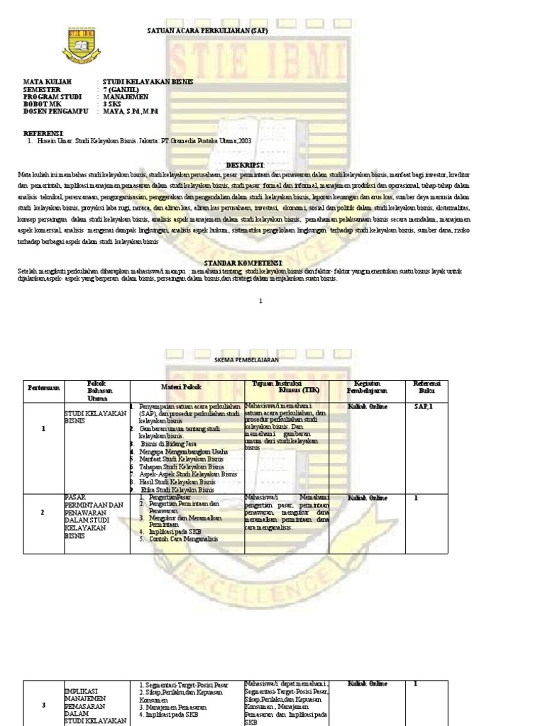 Berikut ini merupakan Rencana Pembelajaran Semester Mata Kuliah Studi Kelayakan Bisnis pada Semester 6. - Perencanaan dan organisasi dalam dunia bisnis.