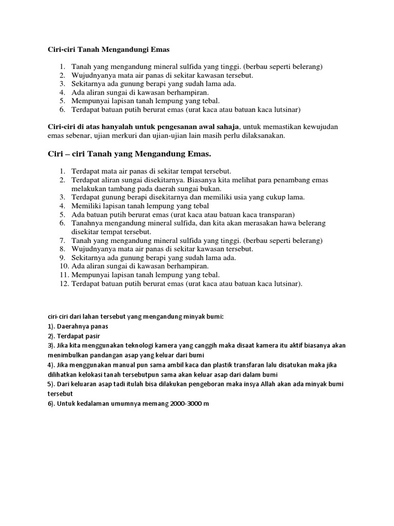 Ciri – ciri Tanah yang Mengandung Emas. Terdapat mata air panas di sekitar tempat tersebut. Terdapat aliran sungai disekitarnya. Biasanya kita melihat para penambang emas melakukan tambang pada daerah sungai bukan. Terdapat gunung berapi disekitarnya dan memiliki usia yang cukup lama. Memiliki lapisan tanah lempung yang tebal Berikut ini adalah cara untuk mengetahui ciri tanah mengandung emas. Beberapa jenis formasi tanah dan batuan yang lebih cenderung memiliki ciri ciri pasir mengandung emasbantalan emas disebabkan proses dari lingkungan dan geologi. Setelah digoyang goyang akan tampak pasir hitam yang menurut penambang disebut pasir penghantar emas. Ciri ciri tanah mengandung emas. Ciri ciri tanah yang mengandung emas dan proses pengambilannya. Mendulang emas adalah mata pencarian masyarakat indonesia dengan harganya yang mahal membuat semua orang selalu memburu emas itudengan mendulang emas ekono. Vlog cara mengetahuii sungai yg memiliki kadar emas nya.