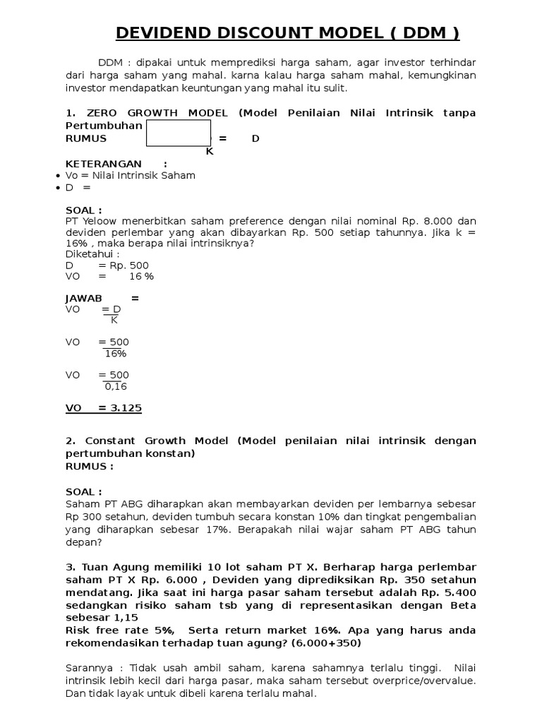 Maka nilai intrinsik saham ini perlembarnya adalah sebesar : Po = Rp5.090,02,- 17. Penilaian Saham Biasa Dividen Bertumbuh Secara Konstan (Constant Growth Model) Dividen tumbuh sesuai dengan tingkat pertumbuhan perusahaan Model ini mengasumsikan bahwa dividen tumbuh pada suatu tingkat tertentu (g) / konstan Model ini cocok untuk perusahaan yang ... Jika nilai intrinsik saham sama dengan nilai pasar, maka saham dikatakan fair valued atau sesuai dengan harga sebenarnya. Dalam hal ini, pergerakan harga pasar dianggap sebanding dengan kinerja fundamental dari saham itu sendiri. Rumus Nilai Intrinsik Saham Cara menghitung nilai intrinsik saham yaitu dengan menggunakan rumus.