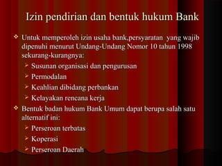 Pendirian,Bentuk Badan Hukum, dan Kerahasiaan Bank Ada beberapa bentuk hukum bank yang dapat dipilih jika ingin mendirikan bank sesuai dengan undang-undang nomor 10 tahun 1998.. Bentuk badan hukum Bank Umum dapat berupa salah satu dari alternative di bawah ini: Perseroan Terbatas Koperasi atau Perseroan daerah (PD)