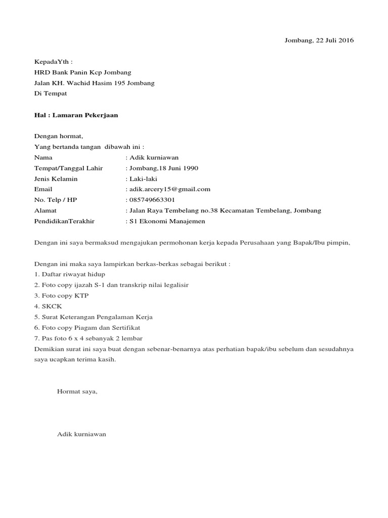 Contoh surat lamaran bank. √ Contoh Surat Lamaran Kerja di Bank BNI, BCA, Mandiri ... Contoh Surat Lamaran Kerja Di Bank sebenarnya tidak jauh berbeda dengan surat lamaran kerja pada umumnya. Yang membedakan hanya tujuannya yaitu untuk melamar kerja di bank. Seperti lamaran kerja pada umumnya, terdapat beberapa hal yang harus diperhatikan ketika menyusun Surat Lamaran Kerja, antara lain : Menyebutkan nama dan alamat bank yang ... 16 Contoh Surat Lamaran Kerja di Bank BRI, BNI, BCA, dll ... 15. Contoh Lamaran Pekerjaan di Bank yang Baik dan Benar. Menulis surat lamaran kerja di bank tentu harus ditulis dengan baik dan benar. Hal tersebut agar bisa menarik perhatian dari pihak bank yang anda lamar, dan memperbesar kemungkinan anda untuk dipanggil interview. 25 Contoh Surat Lamaran Kerja di Bank yang Benar (Terbaru ... Contoh Surat Lamaran di Bank. Menulis surat lamaran kerja di bank bukanlah hal yang sangat susah. Namun selain surat lamaran, anda juga harus mempersiapkan berkas - berkas yang dibutuhkan sebagai syarat administrasi dalam melamar pekerjaan di bank.. Untuk anda yang ingin melamar pekerjaan di suatu bank, maka tentu harus mempersiapkan terlebih dahulu diri untuk menghadapi test serta interview. Contoh Surat Lamaran Kerja Bank Danamon - Contohsurat Contoh Surat Lamaran Kerja di Bank Danamon melalui Media Cetak. Jakarta, 18 Juni 2015. Perihal : Lamaran pekerjaan. Kepada Yth, Kepala HRD. Bank Danamon. Di Tempat. Dengan hormat, Berdasarkan informasi yang saya dapatkan dari koran Kompas pada tanggal 17 Juni 2015 yang memberitahukan pekerjaan di Bank Danamon tentang lowongan kerja sebagai ...