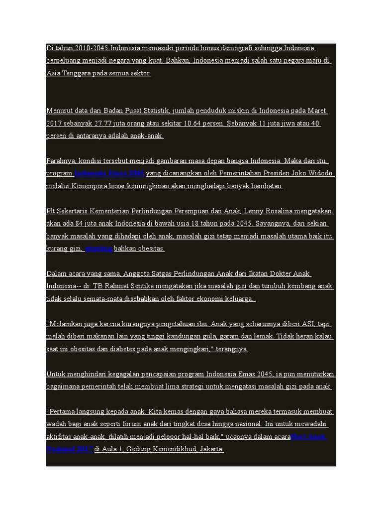 Faktor penghambat indonesia emas 2045. Berita Terupdate terkait Visi Indonesia 2045 - Bisnis.com Berita Visi Indonesia 2045 - Perjanjian tersebut memiliki hal positif terutama pada komitmen antar dua negara untuk mendirikan program kerja sama ekonomi, agar bisa mencapai pemanfaatan maksimal dan menghasilkan manfaat secara mutual dari IA-CEPA. Kompas.id Emas Papua Modal Berharga Indonesia Emas. Tiga tahun sudah, PT Freeport Indonesia dikuasai secara moyoritas oleh Pemerintah Indonesia. Pengelolaan tambang bawah tanah terbesar di dunia ini serta pemanfaatan hasilnya ke depan menentukan Indonesia Emas 2045. Ekonomi ·. 23 Agustus 2021. Indonesia Emas 2045 - ILUNI FEB UI Indonesia Emas 2045 Home » Indonesia Emas 2045 Menuju 100 tahun kemerdekaan Indonesia di 2045, Indonesia memiliki beberapa tantangan utama antara lain adalah untuk mengoptimisasi peluang dari bonus demografi dan untuk bisa lolos dari jerat middle-income trap. Tahapan Besar Menuju Indonesia Emas 2045 | Sekretariat Negara Tahapan Besar Menuju Indonesia Emas 2045. Negara-negara maju merupakan negara yang memiliki kualitas infrastruktur dan sumber daya manusia (SDM) yang baik. Dua hal tersebut sangat disadari oleh Presiden Joko Widodo dan menjadi motivasinya untuk berfokus pada hal itu untuk mewujudkan Visi Indonesia Emas 2045.