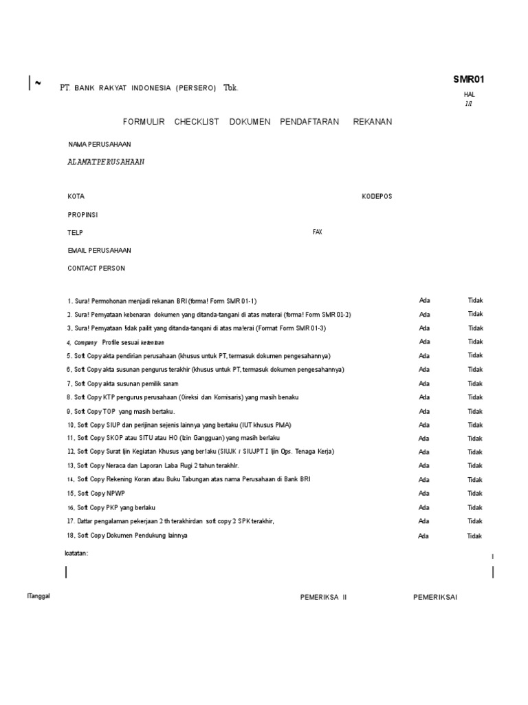 Persyaratan Menjadi Rekanan BUMN Bank BRI by madhi_arch Syrarat Rekanan BRI. Uploaded by. Madhi Arch. Description: Persyaratan Menjadi Rekanan BUMN Bank BRI. Copyright: © All Rights Reserved. BANK RAKYAT INDONESIA (PERSERO) Tbk. SMR01 Hal 1/1. Formulir checklist dokumen pendaftaran rekanan.