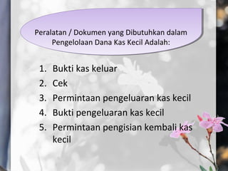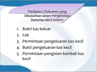 Dana Kas Kecil: Dana Kas Kecil · Karakteristik Dana Kas Kecil sebagai berikut : 1. Jumlah dibatasi sehingga tidak melebihi/tidak kurang dari suatu Metode Metode yang digunakan dalam mencatat Kas Kecil ada 2 yaitu Peralatan yang dibutuhkan untuk pengelolaan dana kas kecil adalah : • Formulir permintaan pengisian dana...