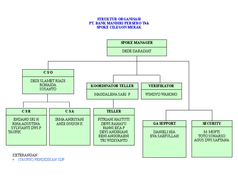 Struktur organisasi bank mandiri. › contoh-soal-psikotes-bankContoh Soal Psikotes Bank Bca Dan Jawabannya Pdf | Literaturku Nov 26, 2021 · Contoh soal tes shl bank bca soal tes psikotes bca qwerty soal soal psikotes kemampuan verbal sinonim antonim. Soal latihan ini berisi soal psikotes seri deret dan matematika yang sering ditanyakan dalam ujian di bank seperti psikotes bank Mandiri BCA BNI Danamon BTN dan berlaku juga untuk yang syariah. Dan untuk gaji adm itu sekitar 19 juta. 7 Jabatan di Bank & Tugasnya Selain CS dan Teller - Hipwee 7 Jabatan di Bank & Tugasnya Selain CS dan Teller. Nggak bisa dimungkiri, perbankan menjadi salah satu bidang pekerjaan yang nggak pernah sepi peminat. Banyak fresh graduate yang berasal dari berbagai latar belakang pendidikan melamar pekerjaan di bank demi bisa menjadi salah satu pegawainya. Meski bukan PNS, penghasilannya memang cukup lumayan ... PT Bank Mandiri Taspen Kantor Pusat Bank Mandiri Taspen Graha Mantap Jl. Proklamasi No.31 Kec. Menteng, Kota Jakarta Pusat, Daerah Khusus Ibukota Jakarta 10320 Telp. (62-21) 212-31772 Fax. (62-21) 212-31984 Indonesia (DOC) Makalah bank mandiri | resta aprilia - Academia.edu 2. Mengetahui sejarah bank mandiri. 3. Untuk mengetahui pengertian dari bank . 4. Untuk mengetahui apa saja layanan yang ada di bank mandiri. 5. Untuk mengetahui kelebihan yang dimiliki bank mandiri. 1 6. Menambah informasi mengenai suku bunga dan valas . 7. Untuk mengetahui struktur organisasi yang ada di bank mandiri.