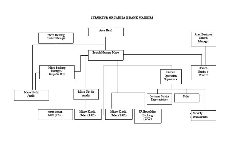 Struktur Organisasi PT. Bank Mandiri (Persero) Tbk. Struktur organisasi yang digunakan oleh Bank mandiri di atas merupakan bentuk struktur organisasi lini (Line Organization Structure), yaitu organisasi yang wewenang atasan langsung ditujukan kepada bawahan, karena bawahan bertanggung jawab langsung kepada atasannya dan adanya suatu perintah.Pembagian tugas dan wewenang dalam Bank mandiri jika di lihat dari struktur organisasinya sangat jelas ...