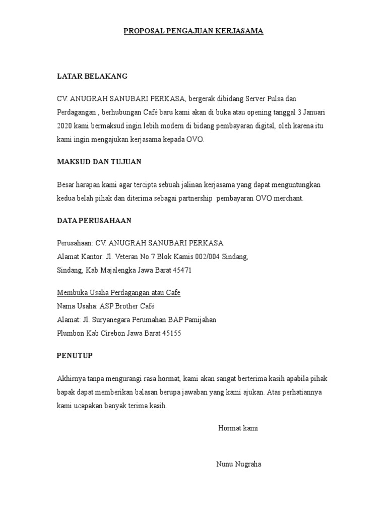 Ini Tips Membuat Proposal Kerjasama Bisnis ... - asriman.com Terlebih, banyak contoh proposal kerjasama bisnis properti yang mereka pelajari selama ini, ternyata tidak sesuai dengan yang diharapkan para investor. Bagi developer yang masih belum menguasai pembuatan proposal kerjasama bisnis properti, berikut beberapa tips yang bisa dijadikan petunjuk: Pahami Trust, Safety dan Profiability 9 Contoh Proposal Kegiatan, Bantuan Dana, Kerjasama ... woazy.com - Contoh proposal. Proposal lazimnya dikenal sebagai sebuah dokumen yang berisi rencana kegiatan yang terancang secara sistematis dan terperinci. Biasanya pembuatan proposal dimaksudkan untuk menjelaskan kepada pihak tertentu akan adanya sebuah kegiatan yang akan dilaksanakan pada waktu yang akan datang. Mengapa dokumen penjelasan ini dibuat karena pelaku atau pelaksana kegiatan ... 4 Contoh Proposal Usaha Lengkap untuk Gaet Calon Investor ... Contoh proposal usaha digunakan untuk mempermudah pelaku bisnis dalam menjalankan usaha berisi panduan secara rinci dan jelas. Dalam suatu bidang usaha, tentunya harus memuat estimasi modal dan analisis SWOT yang berbeda. Yuk, simak contoh proposal pengajuan modal usaha ke investor yang baik dan benar berikut ini! 4 Contoh Proposal Usaha Lengkap 1.