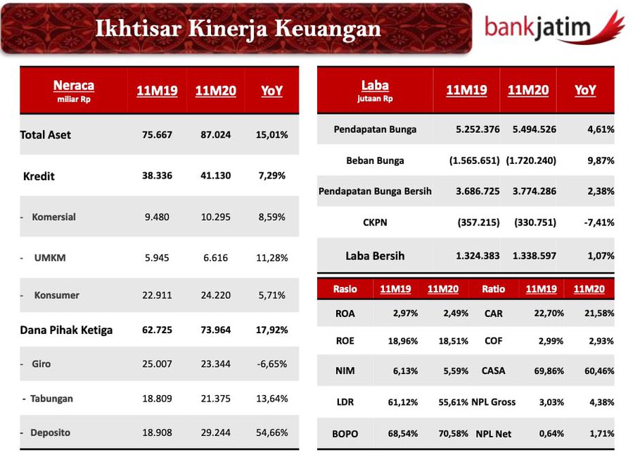 Bank Jatim (BJTM) Raih Laba Rp1,52 Triliun pada 2021. Ini ... Feb 22, 2022 · Direktur Utama Bank Jatim Busrul Iman menjelaskan di tengah kondisi pandemi, penyaluran kredit Bank Jatim mampu tumbuh dengan baik terutama kredit untuk sektor UMKM yang terealisasi Rp7,55 triliun atau tumbuh 11,07 persen yoy, sedangkan kredit komersial mencapai Rp10,46 triliun atau tumbuh 1,28 persen yoy dan kredit sektor konsumsi mencapai Rp24,74 triliun naik 1,58 persen yoy.