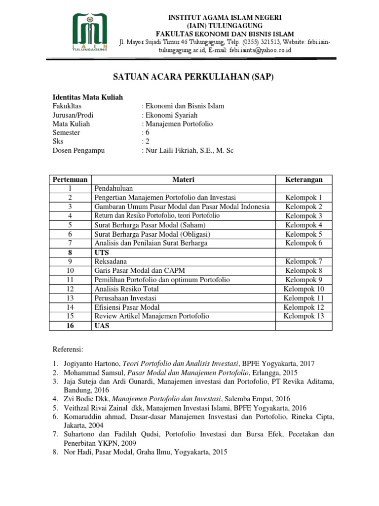 PDF Kontrak Perkuliahan, Silabus, Rps Dan Sap : Manajemen ... Mata kuliah ini membahas Investasi, dasar-dasar manajemen investasi, pengelompokan aset dan instrumen keuangan, fungsi ekonomi dari pasar keuangan, pasar derivatif, mekanisme perdagangan, resiko dan tingkat pengembalian, konsep portofolio, teori