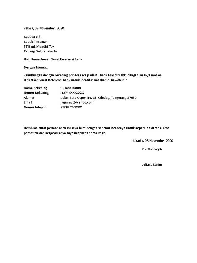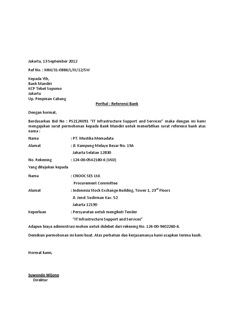 Surat Permohonan Referensi Bank Mandiri AC | PDF Nov 03, 2015 · Perihal : Permohonan Referensi Bank. Kepada YTH, Kepala Cabang Bank Mandiri (Persero) Tbk Kantor Cabang Jakarta RS. Pelni Jl. Aipda KS Tubun 92-94 Jakarta 11410. Dengan Hormat. Sehubungan dengan rekening perusahaan kami pada PT. Bank Mandiri (Persero) Tbk, dengan ini kami mohon dibuatkan Referensi Bank untuk nomor rekening di bawah ini :