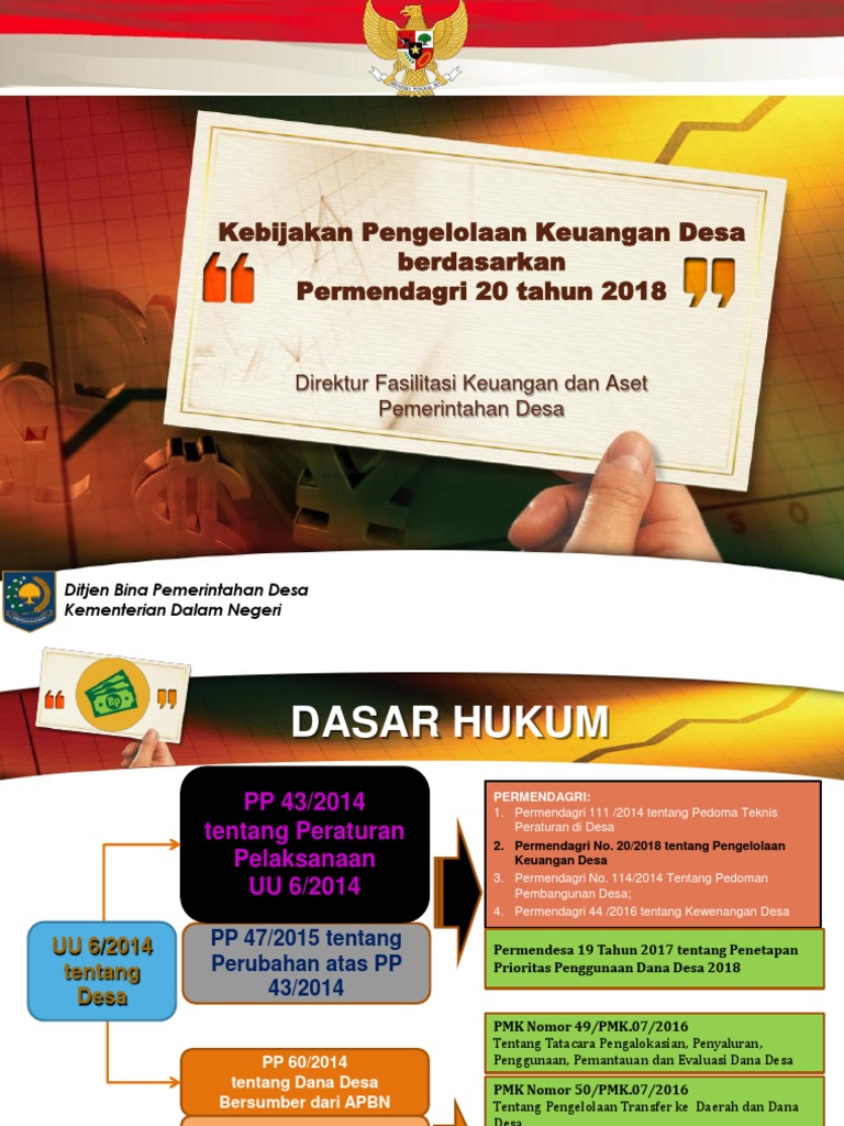 Tupoksi TPK Pengelolaan Dana Desa Tahun 2019 Menurut ... Pemerintah melalui Kementerian Dalam Negeri telah mengeluarkan Permendagri Nomor 20 Tahun 2018 mengenai peraturan baru dalam pengelolaan Keuangan Desa Tahun 2019 yang disahkan tanggal 8 Mei 2018. Peraturan ini dituangkan dalam Peraturan Menteri Dalam Negeri Republik Indonesia Nomor 20 Tahun 2018 Tentang Pengelolaan Keuangan Desa.