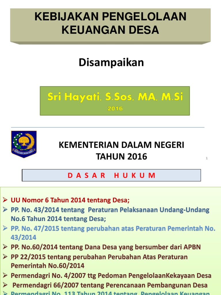 Permendagri 113 tahun 2014 Pengelolaan Keuangan Desa ... Permendagri tentang Pengelolaan Keuangan Desa yang baru ini dibuat untuk melaksanakan ketentuan Pasal 106 Peraturan Pemerintah Nomor 43 Tahun 2014 tentang Peraturan Pelaksanaan Undang-Undang Nomor 6 tahun 2014 tentang Desa perlu menetapkan Peraturan Menteri Dalam Negeri tentang Pedoman Pengelolaan Keuangan Desa.