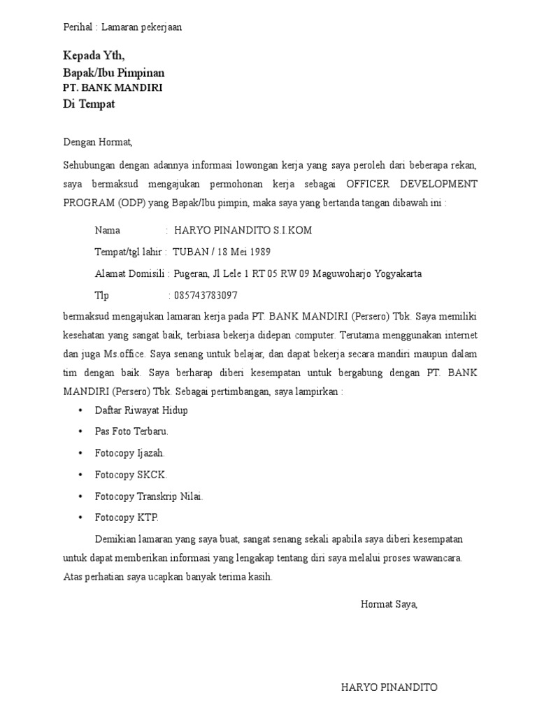 Surat Lamaran Kerja: Fungsi, Format Tips, dan Contoh ... Contoh Surat Lamaran Kerja 2. Kepada YTH. HRD Bank Mandiri Cabang Malang Jln. Kawi Kav. V Malang. Dengan hormat, Seperti halnya dengan informasi yang ada pada lowongan kerja di Bank Mandiri Berikut data singkat saya: Nama : Sabilatul Masyithoh Sutendi Tempat/Tanggal Lahir : Yogyakarta, 24 Juli 1987 Alamat : Jl. Merpati Putih no. 23B No. Hand ...
