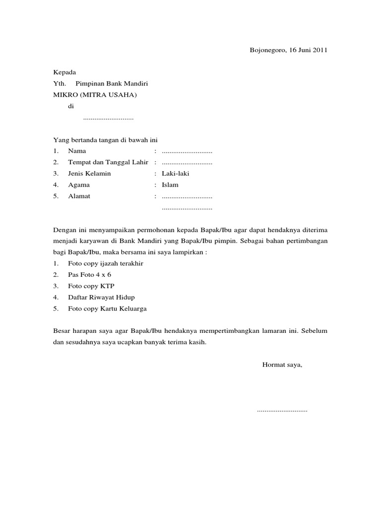 Surat lamaran kerja bank mandiri. Contoh Surat Lamaran Kerja Di Bank Mandiri - Contoh Surat Surat lamaran kerja di bank merupakan sebuah surat yang dibuat oleh seorang pelamar yang hendak bekerja pada sebuah bank, baik itu swasta maupun non swasta. Banyak bank yang ada di Indonesia bisa Anda pilih untuk bekerja, seperti BRI, BNI, Mandiri, BCA, CIMB Niaga, dan bermacam BPR dan BPD. √ Contoh Surat Lamaran Kerja di Bank BNI, BCA, Mandiri ... Contoh Surat Lamaran Kerja Di Bank Mandiri Yang terhormat, HRD Bank Mandiri Cabang Kudus Jalan Jend Sudirman 63, KudusDengan hormat, Saya yang bertanda tangan di bawah ini : Nama Lengkap : Rina Febriana Tempat, Tanggal Lahir : Kudus, 12 Januari 1992 Jenis Kelamin : Perempuan Alamat : Jalan A Yani 32, Kudus Pendidikan Terakhir : S1 Akuntansi ... Contoh Surat Lamaran Magang Di Bank Mandiri | Apapun Ada Contoh Surat Lamaran Kerja Di Bank Syariah Mandiri. 7 contoh surat lamaran kerja di bank bri btpn bca bni mandiri mega yang baik dan benar surat lamaran kerja september 22 2019 0920 surat lamaran kerja di bank sebenarnya tidak jauh berbeda dengan surat lamaran kerja pada umumnya. Contoh surat lamaran kerja di bank mandiri bni bri bca. 5 Contoh Surat Lamaran Kerja di Bank BRI, Mandiri, dll ... Contoh Lamaran Pekerjaan di Bank - berikut ini kami sajikan kepada para pembaca khususnya bagi para pencari kerja yang ingin mengajukan surat lamaran pekerjaan di perusahaan perbankan seperti di BANK BNI, BRI, BCA, DANAMON, dan lain-lain. Sengaja kami share beberapa contoh lamaran pekerjaan dengan format yang berbeda-beda dengan maksud agar dapat dipilih yang sesuai kemudian menggunakan ...