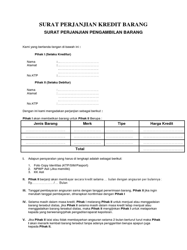 Surat perjanjian kredit barang. 15 Contoh Surat Perjanjian Jual Beli Paling Lengkap ... 15 Contoh Surat Perjanjian Jual Beli Paling Lengkap - Jika anda bermaksud melakukan transaksi baik itu untuk menjual atau membeli maka anda membutuhkan bukti transaksi. Bukti transaksi dibuat berdasarkan nilai dari barang yang diperjualbelikan. Jika nilainya kecil maka bukti bisa berupa kwitansi atau strukt pembelanjaan. Tetapi nilainya besar maka anda membutuhkan surat perjanjian jual beli. CONTOH SURAT PERJANJIAN KREDIT - Abdan-Syakuro.com contoh surat perjanjian kredit - surat perjanjian kredit merupakan sebuah surat yang berisi sebuah perjanjian kesepakatan antara debitur dengan kreditur (dalam hal ini bank) yang melahirkan hubungan hutang piutang, dimana debitur berkewajiban membayar kembali pinjaman yang diberikan oleh kreditur, dengan berdasarkan syarat dan kondisi yang telah … Contoh Surat Penarikan Barang - Content Surat penarikan kendaraan ini, tidak asal dibuat oleh pihak pemberi kredit. Contoh surat penarikan barang inventaris kantor kumpulan surat. Surat ini bisa berisikan penawaran akan barang, jasa ataupun tawaran kerjasama lainnya yang tentunya membawa nilai positif dan keuntungan bagi kedua belah. 3 Contoh Surat Perjanjian Jual Beli Barang di Indonesia ... Ada beberapa transaksi penjualan dan pembelian barang yang membutuhkan sebuah surat perjanjian. Surat perjanjian diperlukan agar transaksi yang memiliki nilai besar menjadi aman dan menghindari terjadinya konflik dan perbedaan pendapat di kemudian hari. Di bawah ini adalah beberapa contoh surat perjanjian jual beli yang perlu Anda ketahui: 1.