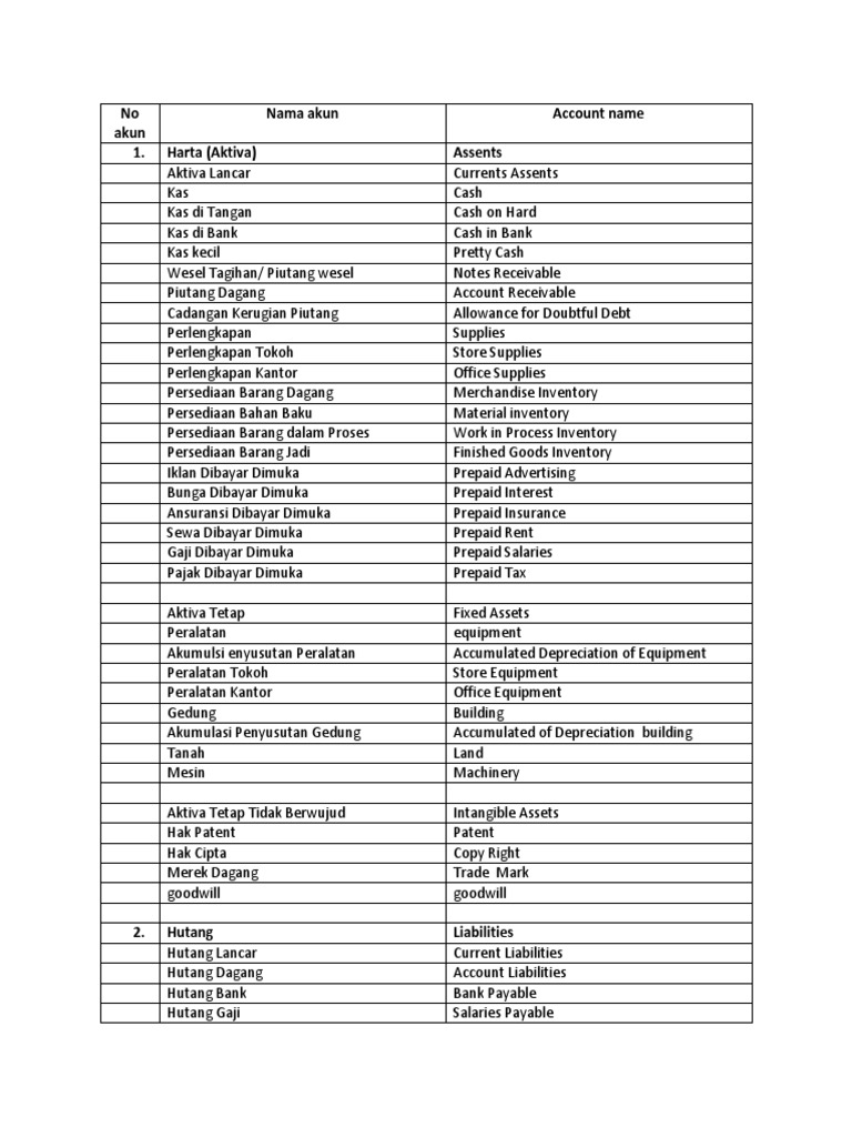 Istilah dalam-akuntansi-dalam-bahasa-inggris Istilah dalam-akuntansi-dalam-bahasa-inggris 1. Istilah-Istilah Dalam Akuntansi NAMA - NAMA PERKIRAAN ( AKUN ) DAN ISTILAH DALAM BAHASA INDONESIA Account Title Artinya Assets Harta Current Assets Harta Lancar Cash In Bank Kas di Bank Petty Cash Kas Kecil Account Receivable Piutang Dagang Allowance For Doubtful Debt Penyisihan Kerugian Piutang Furniture And Fixture Perabot & Inventaris Interest ...