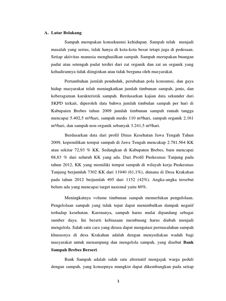 PDF Proposal Pengajuan Bantuan Peralatan Bank Sampah Untuk ... Contoh lainnya adalag Bank Sampah "Gemah Ripah" di Kabupaten Bantul yang merupakan bank sampah pertama di Indonesia yang telah beraktifitas selama 3 tahun.