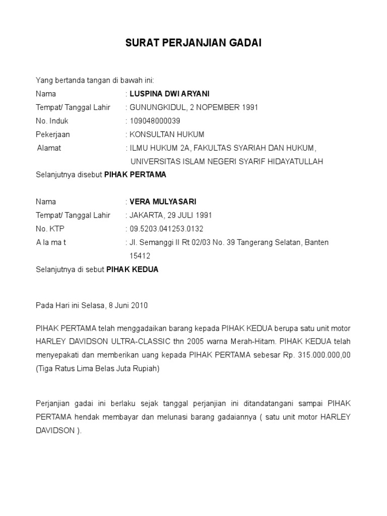Contoh Surat Perjanjian Gadai Sawah - Kumpulan Contoh ... Contoh Surat Perjanjian Gadai Sawah - 32 14 13 10 02 54 0003 selanjutnya disebut. Contoh surat perjanjian gadai mobil. Selanjutnya disebut pihak pertama yang bertandatangan di bawah ini. Yang bertandatangan di bawah ini. Dalam hal ini bertindak untuk dan atas nama diri sendiri selanjutnya disebut. Nadi bin enyim tempat tgl lahir.. › 2012 › 08BELAJAR HUKUM dan DINAMIKANYA YANG DEKAT DENGAN MASYARAKAT DI ... setelah negosiasi berjalan alot, saya pun diajak berunding dan menghasilkan kesepakatan, motor bisa saya bawa pulang kembali untuk haari itu saja dengan surat pernyataan tertulis yg saya buat yg isinya : apabila saya dalam tempo 1 hari setelah surat ini dibuat tidak melunasi / menyerahkan motor tsbt kepada perusahaan maka akan ditempuh jalur hukum. Contoh Surat Perjanjian Gadai Motor yang Benar ... Meski gadai motor dilakukan secara pribadi diharuskan membuat surat perjanjian gadai atas kendaraan motor tersebut dengan melampirkan data lengkap. Surat gadai motor tersebut sifatnya sah jika ditandatangani bersama dengan materai. Berikut ini contoh Contoh Surat Perjanjian Gadai Motor yang Benar.
