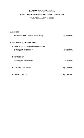 Pengertian Lengkap Tentang Laporan Pertanggungjawaban ... Laporan Penggunaan Dana Pelaksanaan kegiatan bukanlah satu-satunya yang ditulis pada LPJ. Ada juga laporan penggunaan dana, yang juga tidak kalah pentingnya. Laporan penggunaan dana berisi tentang asal sumber dana dan rincian penggunaan dana tersebut. Pada perusahaan, laporan penggunaan dana wajib disertakan dalam laporan pertanggungjawaban.