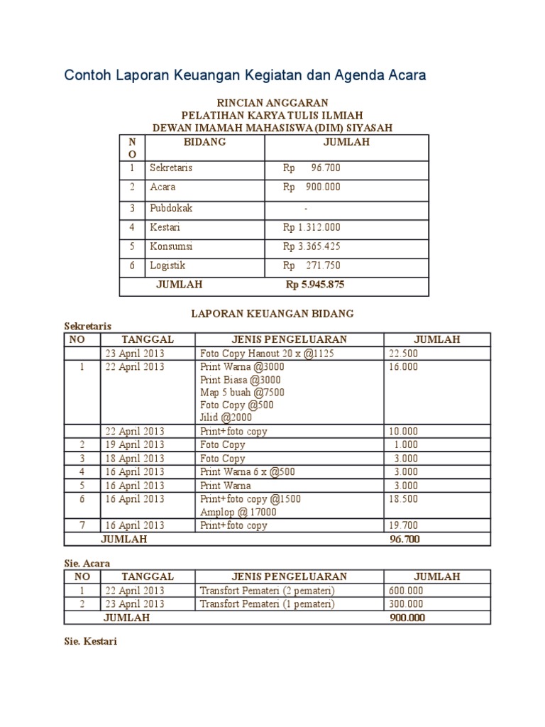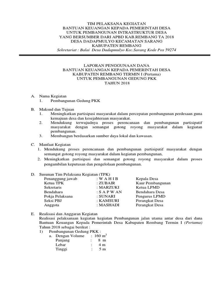 Pengertian Laporan, Fungsi, Tujuan, Syarat dan Contohnya ... Meskipun berbagai tujuan dapat disampaikan melalui laporan, pada umumnya laporan digunakan untuk menyampaikan tujuan yang bersifat umum sebagai berikut: Memantau dan mengendalikan suatu kegiatan. Membantu mengimplementasikan kebijakan dan prosedur yang telah ditentukan Memenuhi persyaratan. Mendokumentasikan kegiatan. Contoh dan Format Laporan Sederhana untuk Berbagai Kegiatan Contoh dan Format Laporan Sederhana, Foto: Pixabay Laporan adalah bentuk pertanggungjawaban dari suatu kegiatan, mulai dari yang sederhana sampai yang rumit. Sebagai bentuk pertanggungjawaban, laporan dikerjakan setelah kegiatan usai dilaksanakan. Format laporan sederhana tentu berbeda dengan format laporan yang rumit dari suatu kegiatan besar. Contoh Laporan Pertanggungjawaban Keuangan Dana Hibah | My ... Contoh laporan pertanggung jawaban lpj bantuan dana desa kata pengantar dengan memanjatkan fuji dan syukur kehadirat alloh swt atas segala rahmat dan karunia nya kami dapat menyelesaikan program kegiatan sebagaimana yang kita harapkan dengan telah selesainya pelaksanaan kegiatan bantuan dana desa tahap 1 tahun 2015.