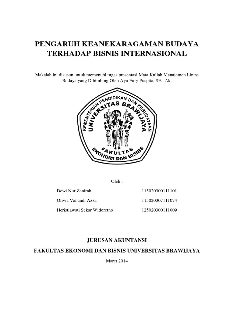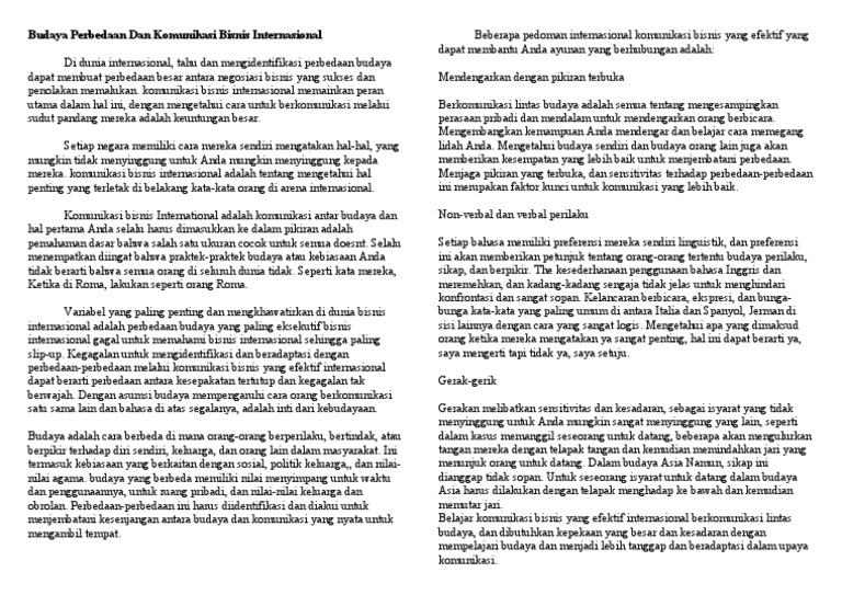 Peran Indonesia di Bisnis Internasional Meningkat WE Online, Jakarta - Jenderal Moeldoko menyebutkan bahwa peran Indonesia dalam dunia bisnis internasional semakin meningkat. Penyataan tersebut diungkapkannya saat wawancara bersama Oxford Business Group (OBG). Athaya Aushafina Pengaruh budaya dalam bisnis internasional dapat diamati dalam tujuh aspek utama. Pertama, bahasa. Bahasa merupakan salah satu elemen budaya yang penting dalam kegiatan bisnis, antara lain untuk mengumpulkan informasi dan bagi perusahaan multinasional untuk mengakses masyarakat lokal. Makalah Bisnis Internasional Tentang Peran Budaya Terkait dengan peran komunikasi bisnis lintas budaya dalam penulisan sebuah laporan maka masalah yang dikaji sebagai berikut. Manfaat dalam penulisan makalah tentang Komunikasi Bisnis Lintas Budaya yakni. Internasional tetapi juga budaya yang tumbuh dan berkembang di berbagai daieah dalam wilayah suatu negara. Makalah Bisnis Internasional Tentang Peran Budaya | Contoh ... Dalam kenyataanya budaya sangat berpengaruh terhadap kelancaran dalam dunia bisnis baik dalam perkembangna dalam bisnis skala nasional maupun skala internasional. Makalah peran bahasa indonesia sebagai bahasa perdagangan era mea dosen pembimbing. Source: studylibid.com