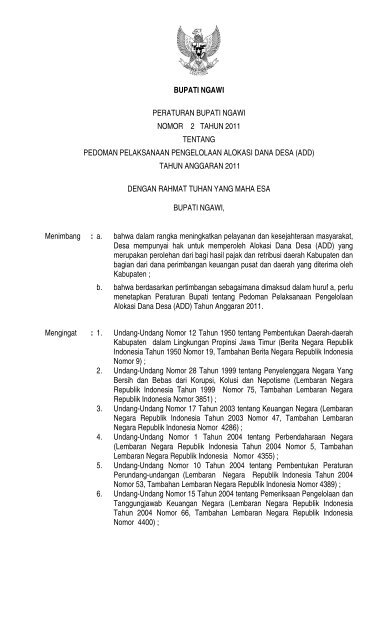 Jaringan Dokumentasi dan Informasi Hukum bupati bojonegoro provinsi jawa timur salinan peraturan bupati bojonegoro nomor 9 tahun 2021 tentang besaran alokasi dana desa, bagi hasil pajak daerah, dan hasil retribusi daerah untuk setiap desa di kabupaten bojonegoro tahun 2021 menimbang mengingat dengan rahmat tui-ian yang maha esa bupati bojonegoro, a. bahwa berdasarkan ketentuan pasal 96 …