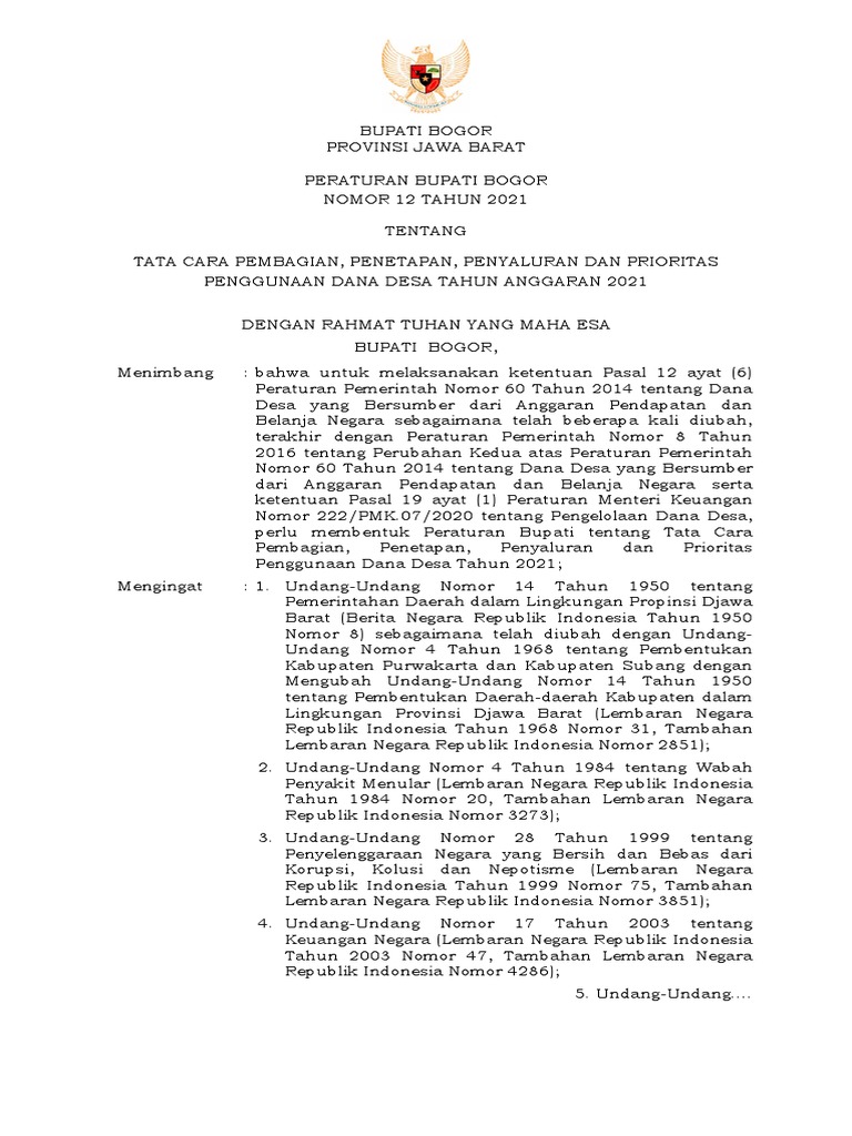 Peraturan bupati tentang dana desa. PERBUP Kab. Batang No. 11 Tahun 2021 tentang Tata Cara ... Peraturan Bupati (PERBUP) Kabupaten Batang Nomor 11 Tahun 2021. Tata Cara Pembagian dan Penetapan Rincian Dana Desa Setiap Desa Tahun 2021. Detail Peraturan. PDF Provinsi jawa tengah | Pagu Dana Desa per-Desa Menetapkan: PERATURAN BUPATI TENTANG TATA CARA PEMBAGIAN, PENETAPAN RINCIAN DAN PENYALURAN SERTA PENGELOLAAN DANA DESA KABUPATEN PEKALONGAN TAHUN ANGGARAN 2021. Bab I ketentuan umum. PERBUP Kab. Alor No. 3 Tahun 2021 tentang Prioritas ... Peraturan Bupati (PERBUP) Kabupaten Alor Nomor 3 Tahun 2021. Prioritas Penggunaan Dana Desa di Kabupaten Alor Tahun 2021. Detail Peraturan. Abstrak. PERBUP Kab. Musi Rawas No. 2 Tahun 2021 tentang ... Peraturan Bupati (PERBUP) Kabupaten Musi Rawas Nomor 2 Tahun 2021. Petunjuk Teknis Pengelolaan Belanja Alokasi Dana Desa dan Dana Desa bagi Pemerintah Desa ...