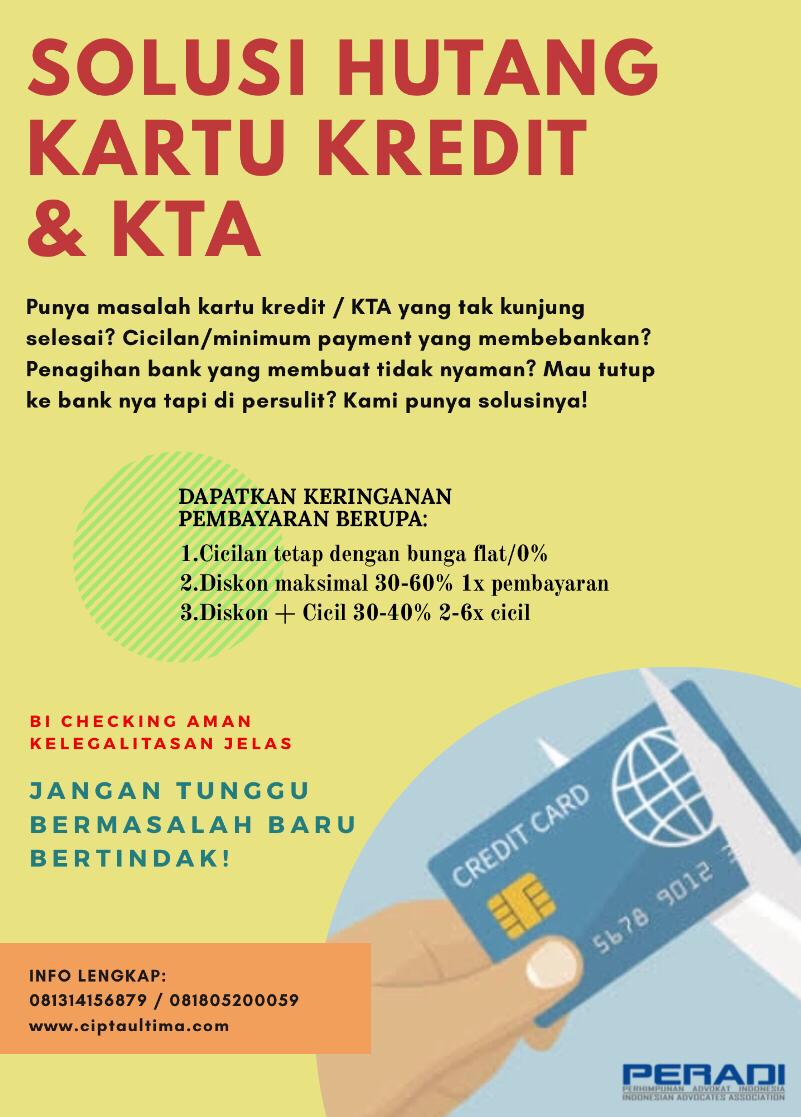 Jasa Penyelesaian Kartu Kredit | Media Kartu Kredit Baiklah kalau begitu Jasa Penutupan Kartu Kredit siap bantu untuk urus pelunasan dan tutup kartu kredit ke card center di bank langsung dengan pendekatan psikologis dan win-win solusi antara Anda dan pihak Bank. Jasa Tutup Kartu Kredit & KTA - Home | Facebook Jasa Tutup Kartu Kredit & KTA, Jakarta, Indonesia. 17 likes. Jasa Mediasi Perbankan (LEGAL) Penyelesaian Tagihan Atau Penutupan Kartu Kredit Dan Kta ... jasa tutup kartu kredit dan KTA dengan diskon potongan pokok hutang sampai 60 % yang dari sisa pokok hutang bisa dicicil tiap bulannya. Kamis, 26 Januari 2017. TESTIMONI CLIEN PENYELESAIAN KREDIT. TESTIMONI CLIEN PENYELESAIAN KREDIT. Diposting oleh law office reqi endar wijanarko & partner di Gudang Solusi Kartu Kredit: PENTING!!!!!!!!!! "penipuan ... ditengan kebingungan saya tersebut, ada Broadcast Massage di BBM yang menjelaskan adanya jasa penyelesaian kartu kredit. dalam broadcast tersebut di jelaskan mengenai program penyelesaian yang sebenarnya. bahkan di broadcast tersebut di cantumkan alamat webnya ( ) serta alamat kantor dan penanggung jawabnya.