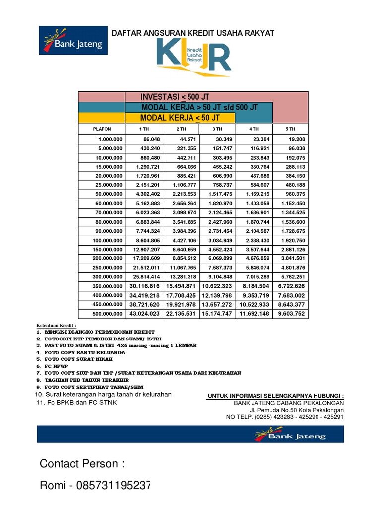 √ KPR Bank Jateng 2022: Suku Bunga, Syarat ... - Idekredit Kredit Kepemilikan Rumah atau KPR merupakan kredit untuk membeli tanah/kavling siap bangun, pemilikan/pembangunan/perbaikan rumah. Dengan adanya produk KPR dari Bank Jateng, kalian dapat mengajukan pembiayaan kredit KPR dengan persyaratan mudah dan suku bunga ringan. Baca √ KTA CIMB Niaga 2022: Keuntungan, Syarat & Biaya. Tabel Angsuran Pinjaman Bank Jateng 2019 - KTA BANK 2022 Tabel Pinjaman Bank Jateng Berikut penampakan tabel angsuran pinjaman dengan nominal kredit Rp 25 Juta dan jangka waktu pelunasan selama 12 kali atau 12 bulan. Tebel di atas merupakan simulasi angsuran pinjaman Mitra Jateng25 dengan suku bunga 7% per tahun serta jenis angsuran annuitas.