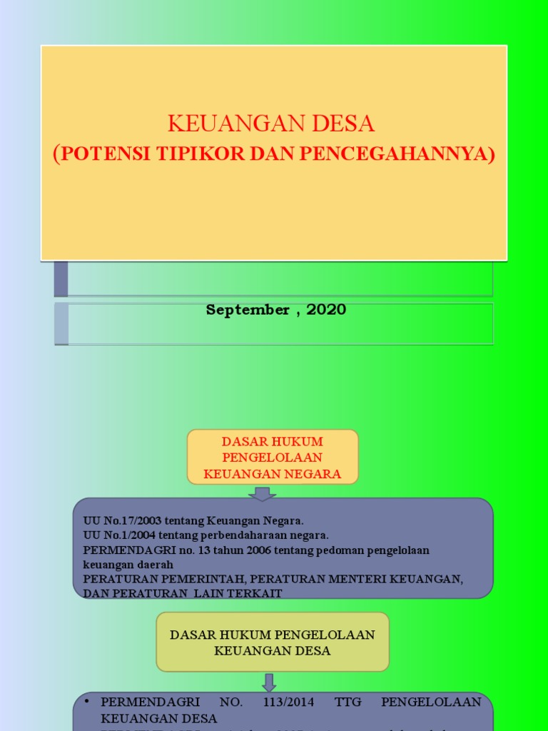 PDF Panduan Pengelolaan Keuangan Desa - Bpkp 2014 tentang Dana Desa yang Bersumber dari APBN, serta beberapa aturan teknis dari Kementrian Dalam Negeri diantaranya yaitu Permendagri Nomor 113 Tahun 2014 tentang Pengelolaan Keuangan Desa. Walau peraturan yang ada masih minimal, tetapi BPKP c.q Deputi Bidang Pengawasan Penyelenggaraan Keuangan Daerah selaku