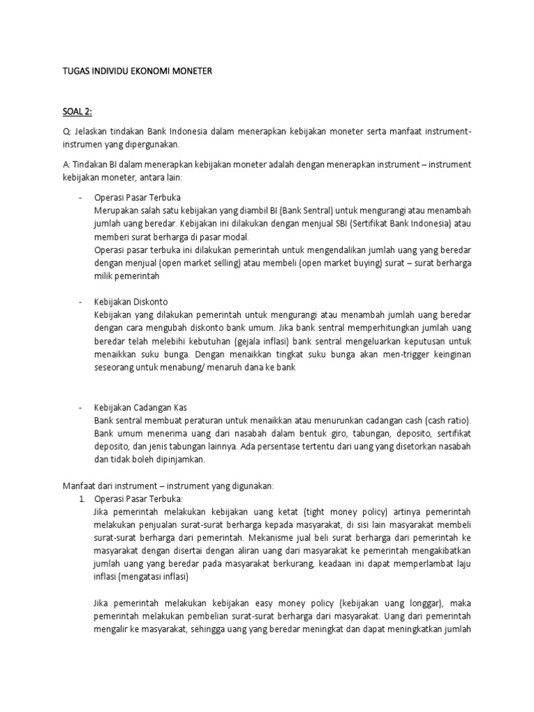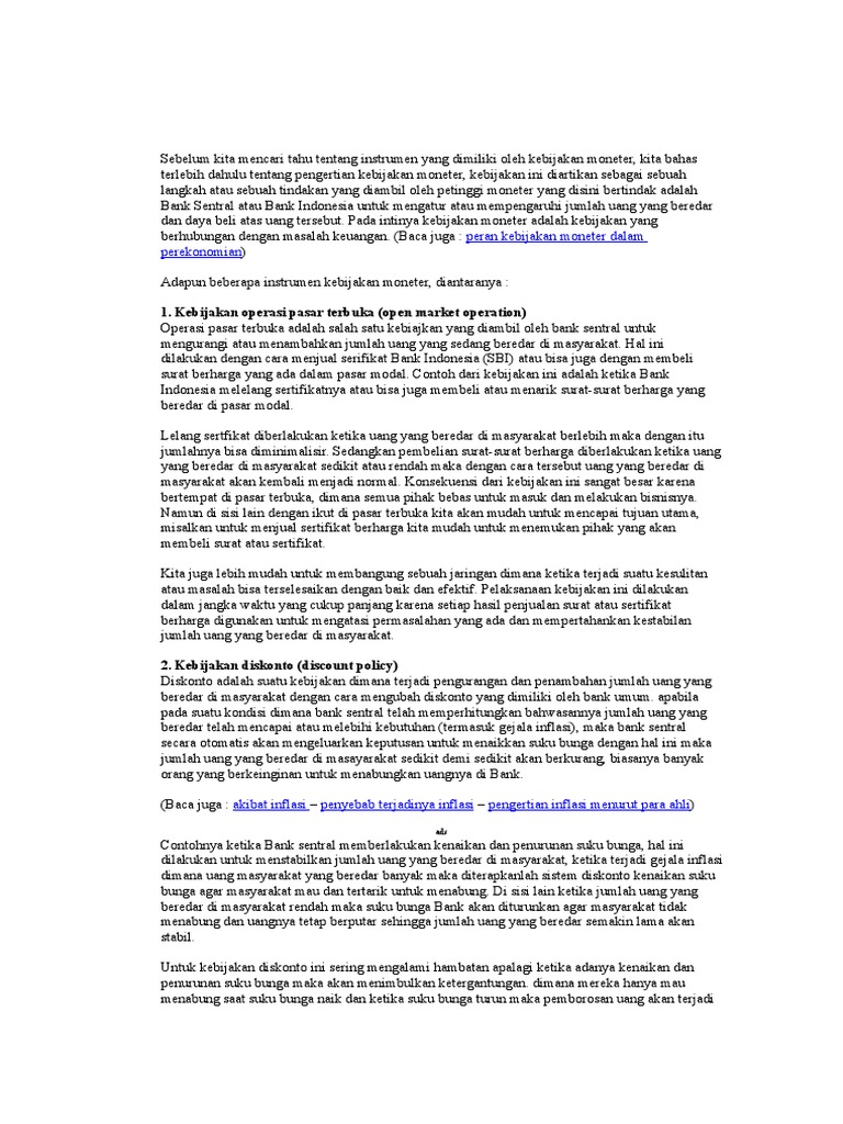 › 5-deposito-terbaik-di-indonesia5 Deposito Terbaik di Indonesia - Cermati.com Mar 04, 2021 · Deposito merupakan salah satu produk penyimpanan uang di bank dengan sistem penyetoran dan penarikannya hanya bisa dilakukan pada waktu tertentu. Ada jangka waktunya sehingga tidak bisa seenaknya diambil. Berbeda dengan tabungan yang bisa ditarik kapanpun, deposito akan mengenakan sejumlah potongan atau penalti kalau ditarik sebelum jatuh tempo. › literasi › bank-sentralPengertian Bank Sentral: Sejarah, Tugas, Wewenang, Serta ... 1. Kewenangan Membuat Kebijakan Moneter. Bank Indonesia perlu menentukan serta menetapkan dengan tingkat diskonto, perlu membuat kebijakan pembiayaan maupun kredit. Bank Indonesia pun harus bisa menetapkan serta menentukan target moneter dengan menentukan tingkat inflasi yang terjadi di Indonesia pada tiap tahunnya. Kebijakan Moneter (Kebijakan Bank Indonesia - Bank Sentral ... Politik diskonto adalah satu kebijakan yang dilakukan oleh bank sentral dengan menambah atau mengurangi jumlah uang dengan cara menaikan atau menurunkan tingkat suku bunga. Jika bank sentral menaikan suku bunga diharapkan masyarakat tertarik untuk menyimpan uang di bank dengan demikian jumlahuang yang beredar berkurang. Cara Bank Indonesia Mengontrol Tingkat Inflasi dan Nilai ... Instrumen kebijakan moneter meliputi : 1. Operasi pasar terbuka ( open market operation) BI menambah atau mengurangi jumlah uang beredar dengan cara menjual atau membeli surat berharga di pasar uang. Untuk menekan inflasi BI mengeluarkan Sertifikat Bank Indonesia (SBI) untuk menghimpun dana dari masyarakat sehingga uang yang beredar berkurang. 2.