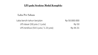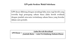 (PPT) LABA PER LEMBAR SAHAM | ikhsan junaedi - Academia.edu LABA PER LEMBAR SAHAM (EARNING PER SHARE) KELOMPOK 5 ASRI IKHSAN JUNAEDI IMAS HAMDAH FATIMAH TRI SOFYANI D f Perhitungan Laba per Lembar Saham Struktur Modal Struktur Modal Kompleks Sederhana fEarnings per share menunjukkan laba yang diperoleh oleh setiap lembar saham biasa. Perusahaan melaporkan EPS hanya untuk saham biasa.