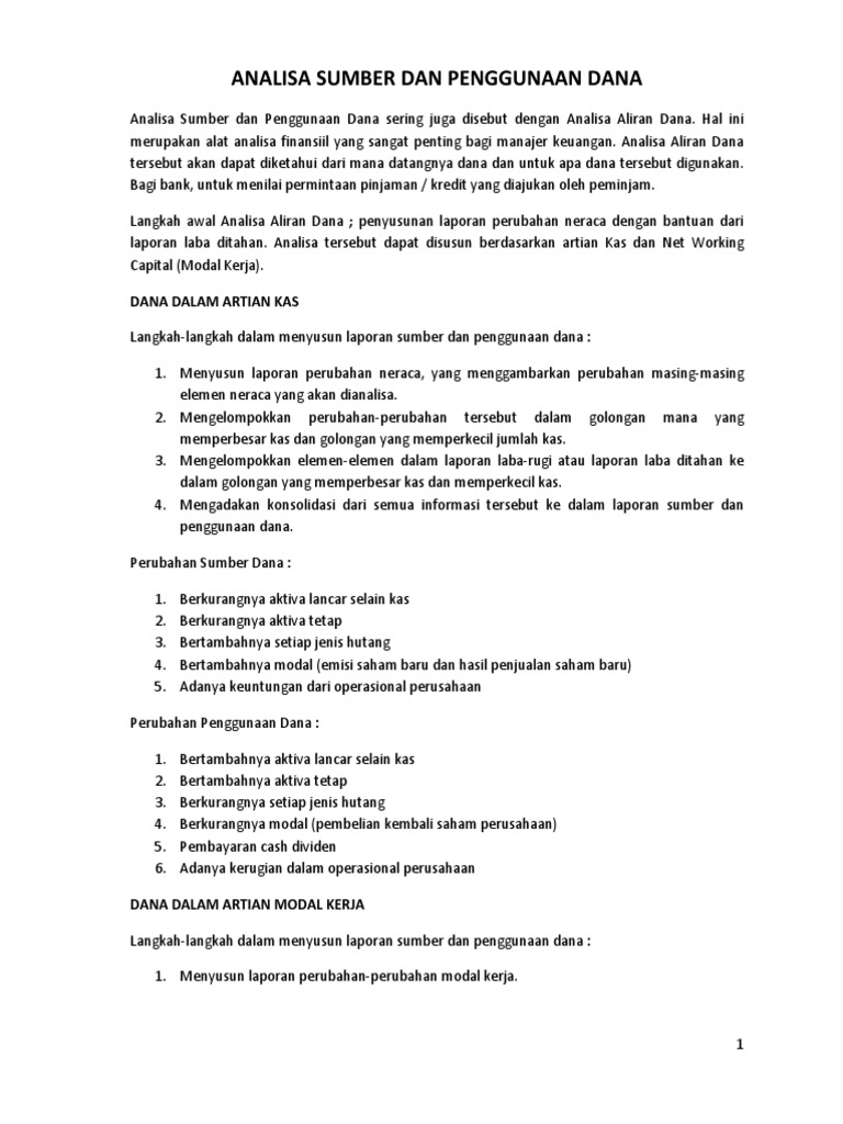 Langkah langkah penyusunan laporan sumber dan penggunaan ... 5. Menyusun laporan sumber-sumber dan penggunaan modal kerja D. Analisis Sumber Dana dan Penggunaannya Analisis sumber dana atau analisis dana merupakan hal yang sangat penting bagi manajer keuangan. Analisis ini bermanfaat untuk mengetahui bagaimana dana digunakan dan asal perolehan dana tersebut. Suatu laporan yang menggambarkan asal sumber dana dan penggunaan dana.